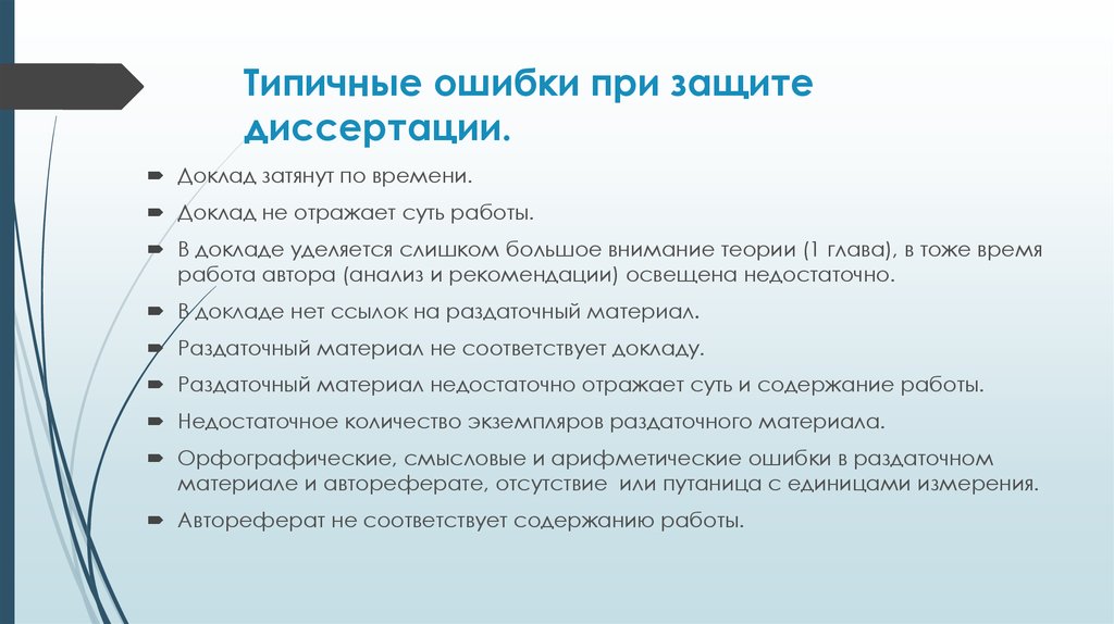 Диссертантом должны быть продуманы все тезисы выступления, чтобы не допустить таких вопросов, на которые ему невозможно было бы ответить.