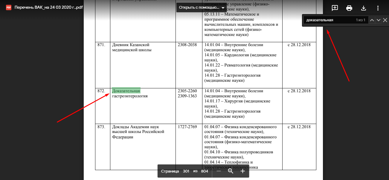 3. Найти нужное название. Нажмите на клавиатуре одновременно кнопки Ctrl + F, появится окно, куда вы можете ввести, например, название журнала или номер шифра специальности, после чего вы увидите нужные для вас варианты журналов.